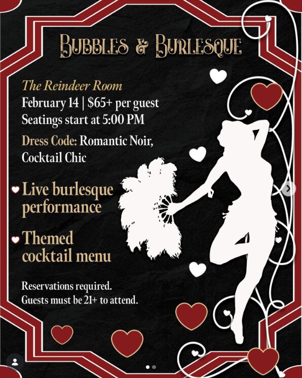 You’re invited to slip away into candlelight, Champagne & Cocktails, and temptation. This Valentine’s Day, The Reindeer Room invites you to an intimate speakeasy soiree where romance simmers, cocktails seduce, and burlesque unfolds in slow, sultry chapters. Designed for couples and lovers of vintage glamour, this is an evening meant to be savored, never rushed.