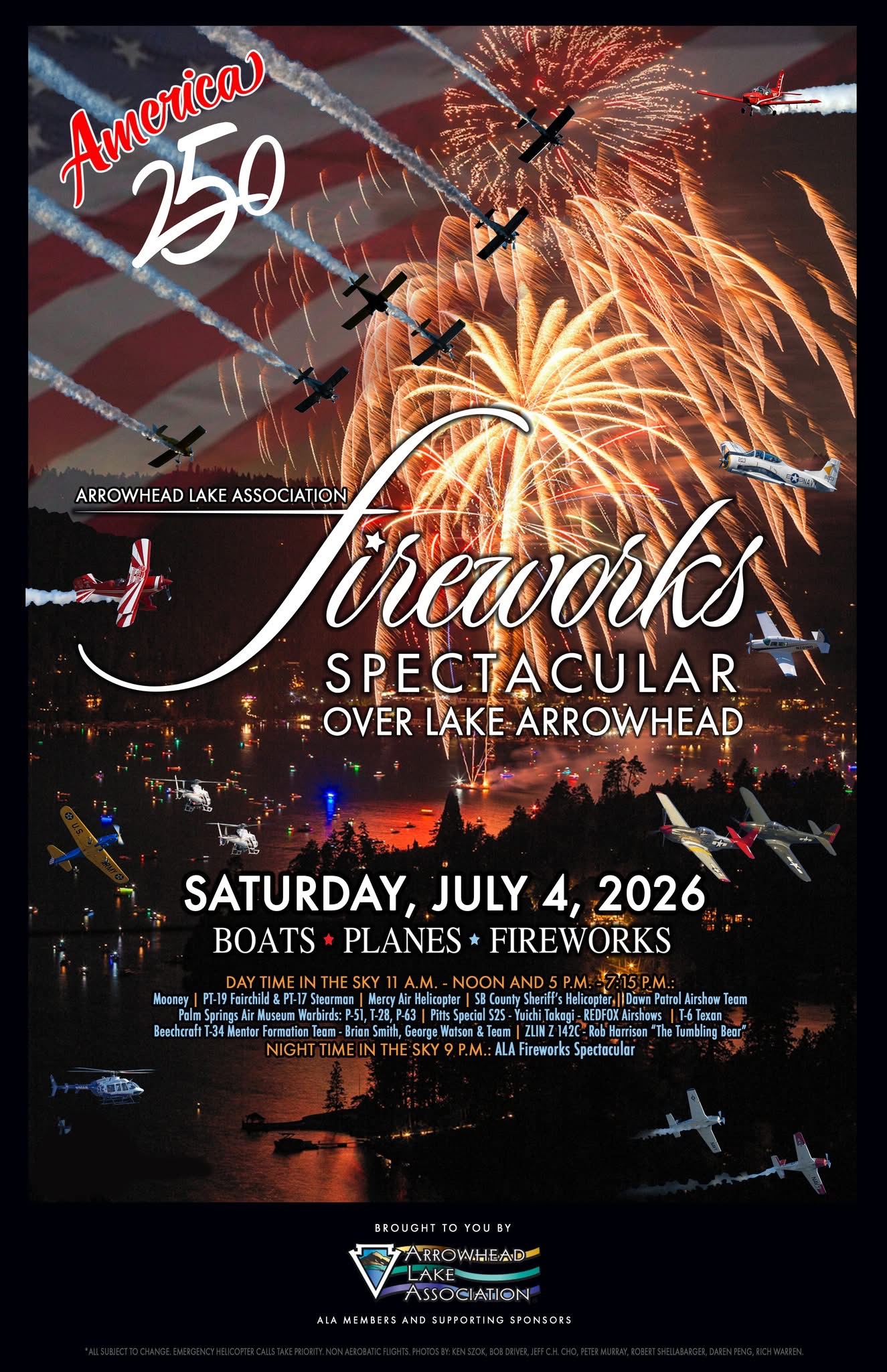 Come and join the festivities to celebrate USA 's 250th Anniversary ! Boats ✰ Planes ✰ Fireworks Day Time in the Sky : 11 am - noon and 5 pm -