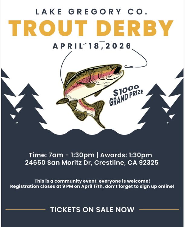 Tickets are now live for our 2nd Annual Trout Derby! Grab your tickets, bring your gear, and we’ll see you at the lake. 🎣 📍 Lake Gregory ☀ Rain or